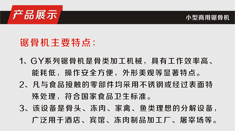 江西眾得力廚具有限公司生產(chǎn)銷售食品機(jī)械商用廚具,承接中央廚房項(xiàng)目整體解決方案!餐飲食堂后廚分解凍肉、骨頭設(shè)備選用鋸骨機(jī),輕松,快速解決問(wèn)題,長(zhǎng)短可調(diào),分解速度快,效率高,骨頭損害小。本系列鋸骨機(jī)有270型和370型兩種型號(hào),270型價(jià)格2550元,370型價(jià)格6880元