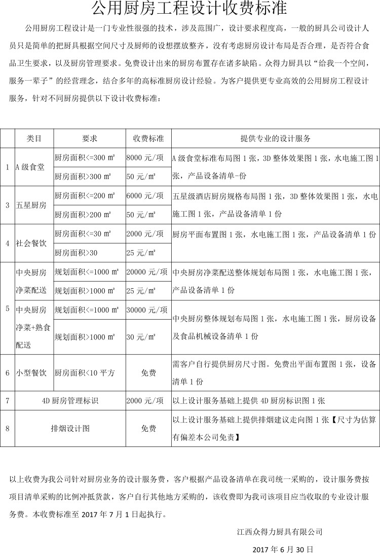 以上設(shè)計收費(fèi),客戶可自行其他公司統(tǒng)一采購,凡廚房設(shè)備清單在我公司一站式采購的,設(shè)計服務(wù)費(fèi)可按比例抵扣貨款。在我司一站式采購廚房設(shè)備,即免以上設(shè)計服務(wù)費(fèi)。
